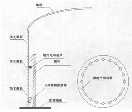 在壁板内侧一周均布20根桅杆,并安装上链式电动葫芦如图所示:桅杆顶应设有系杆,桅杆之间应设10组剪刀叉支撑均布,以保证群桅装置的稳定性。