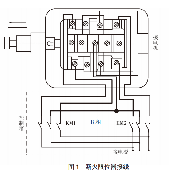 断火限位器正确接线,共有 5 根线,B 相是公共线,靠近推杆一侧的端子接上升接触器的 AC 相,另一侧接下降接触器AC 相线,如果把这位置接反了,当上升限位推杆碰触断火限位器时,电动葫芦仍能上升但不能向下,相反当下降限位推杆碰触断火限位器时,电动葫芦仍能下降但不能向上(图 1)。