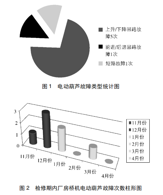 通过对 2013—2014 年检修期电动葫芦故障类型统计( 图 1) 及检修期内厂房桥机电动葫芦故障次数柱形图( 图 2) 的调查分析得出: 上升/下降控制回路故障次数为5 次,前进/后退控制回路故障 1 次,短路故障 1 次。由此可见,电动葫芦控制回路的可靠性有待进一步提高。