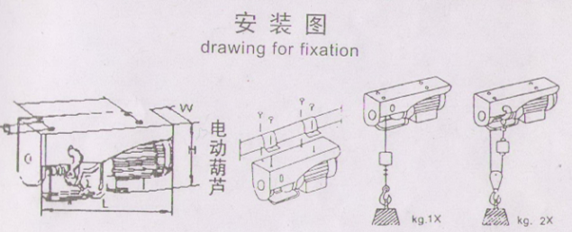 固定微型电动葫芦需要使用六角头螺栓、平垫圈、弹簧垫圈等附件。要确保各位件正确安装,并用力矩扳手将螺栓紧固,“安装图”。要确保固定环(或其它代替件)紧紧压住安装杆(圆杆或方杆),使微型电动葫芦机身不能沿安装杆移动或转动。