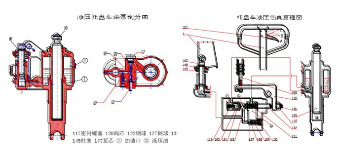 搬运车的起升过程:将捏手107置于A位置,此时卸荷撞针132没有抵触钢球122,此时摇动手柄1,泵芯147在手柄1和弹簧149的共同作用下将作往复运动。当泵芯147向上提升时,柱塞泵a腔内形成负压,阀芯120和阀体121在弹簧119的作用下处于罐壁装填,而钢球122由于油压作用自动打开,油压油从贮油室F腔流经e腔,再经钢球122进入柱塞泵a腔内,柱塞泵吸油过程完成。