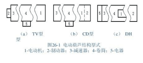电动葫芦的种类:电动葫芦根据电动机、卷筒、制动器等主要部件位置的不同分为TV型、CD型和DH型,其部件相对位置如下图: