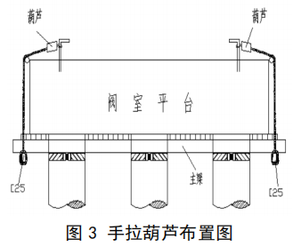 拆除底模支撑系统时,首先在阀室平台上部的两端各安置1个手拉葫芦,手拉葫芦的顶端挂在预埋的 Φ25mm 的钢筋上,底部各吊 1 根 [25 的槽钢,槽钢垂直于主梁 I36a工字钢,将两根主梁支撑起;然后慢慢地逐个松动抱箍的高强螺栓,使抱箍下降一定的高度,为拆除工字钢和木方留出空间,再将高强螺栓紧固至一定的程度,保证抱箍至少能承受工字钢和木方的自重;最后将底模、木方、槽钢和工字钢依次取出。手拉葫芦布置如图 3 所示。