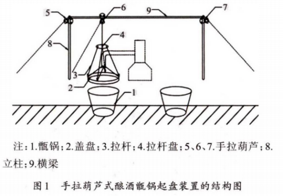 甑桶蒸馏技术不仅操作简单,还能保证酒味纯正,因为在白酒生产过程中被广泛应用。为了减少起盘、封盘过程中的劳动量,设计了一种手拉葫芦式酿酒甑锅起盘装置。要求该装置在将盖盘上拉过程中可减少所需拉力,待盖盘上升至所需高度后可使盖盘在两口甑锅之间来回移动,移动过程中不可使盖盘摇摆幅度过大,最终达到省时、省力、方便的效果,消除在生产过程中存在刮伤、烫伤的安全隐患。