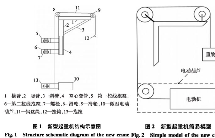 新型起重机是由三角架⑷、抱箍、滑轮、电动葫芦、小型发电机等单位组成,整体结构如图1所示。架体是由横臂、竖臂、斜臂、滑轮焊接成的三角架结构,套管与竖臂采用插接方式相连,滑轮分别设置在横杆两端,拉绳穿过滑轮固定在电动葫芦上。吊装设备时,可以通过控制器控制电动葫芦装置闵轻松吊起重量较大的设备,起吊设备不受地形限制,成本低廉,便于携带和安装,起吊过程安全、平稳、有序。