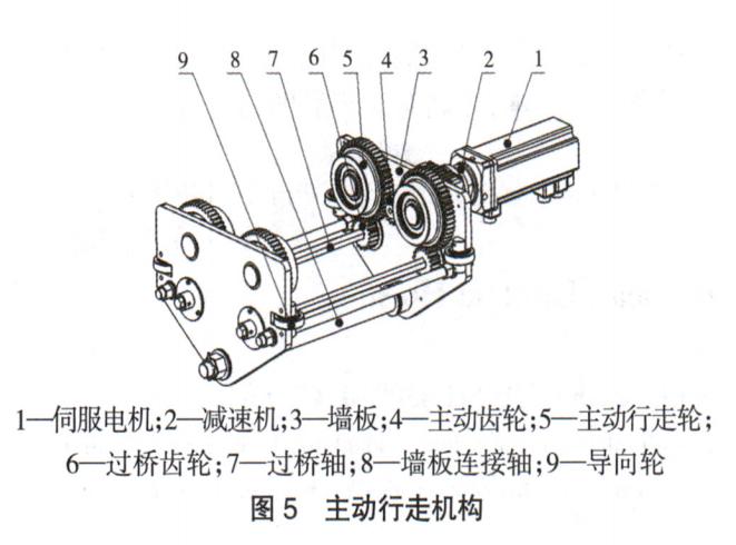 墙板是电动葫芦行走机构的主要结构件,与过桥轴、墙板连接轴一起组成行走机构的结构框架。墙板分为左右两块,右侧墙板固定有减速机,减速机一端固定有伺服电机,另一端固定有主动齿轮。主动齿轮与两个固定在右侧墙板上的主动行走轮啮合,主动行走轮与固定在右侧墙板上的过桥齿轮啮合,过桥齿轮连接过桥轴,驱动固定在左侧墙板上的过桥齿轮,进而驱动固定在左侧墙板上的主动行走轮,实现电动葫芦行走机构四个主动行走轮的同步运行。