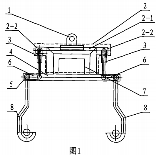 这种吊索具由吊环(1)、框架体(2)、两个液压油缸(3)、两个横梁(4)、两个吊钩轴(5)、两个连动梁(6)、液压泵(7)和四个吊钩(8)组成,其特征在于:所述吊环(1)的下端面固接在框架体(2)的上端面上,所述两个横梁(4)水平设置在框架体(2)的下方,所述所述两个横梁(4)水平设置在框架体(2)下端面上,所述两个液压油轴缸(3)的缸体分别固接在框架体(2)的两侧,所述两个液压油缸(3)的连杆下端分别与连动梁(6)的一端连接,所述两个吊钩轴(5)与两个横梁(4)构成四框体,所述两个横梁(4)的两端分别与吊钩轴(5)转动连接,所述两个吊钩轴(5)的中部分别与连动梁(6)的另一端连接,每个吊钩轴(5)的两端分别固接有吊钩(8),所述液压泵(7)位于框架体系(2)内并与框架体(2)固接,所述两个液压轴(3)通过油管分别与液压泵(7)连通。