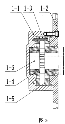(2)如图2所示,其中:非圆轮系液压马达1主要由壳体1-1、前端盖1-2、非圆轮齿轮组1-3、上配流盘1-4、下配流盘1-5、轴1-6组成,该部分的主要功能是将压力水、压力油等液压源的液压能转换成旋转的机械能驱动手拉葫芦进行工作。如图5所示,所述非圆轮齿轮组由外齿圈1-3-1、转子1-3-2及滚轮1-3-3组成,所述滚轮1-3-3设在内部,转子1-3-2设在滚轮1-3-3和外齿圈1-3-1中间,通过转子1-3-2带动滚轮1-3-3和外齿圈1-3-1转动。