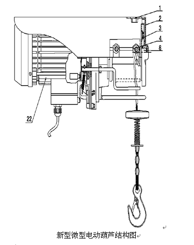 备注:下图为新型的微型电动葫芦,其中1罩壳,2罩壳端板,3右端板,4排线器组件,8转轴,22电机。