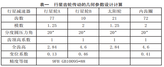 行星齿轮减速器的主要传动结构由行星轮、太阳轮、内齿圈三部分组成。相对于其他减速器,具有高刚性、高精度、高的扭矩与体积比等优点。尤其传动效率高,单机行星齿轮减速器效率在97%-98%之内。行星减速器的行星齿轮传动的集合参数设计计算如下表。