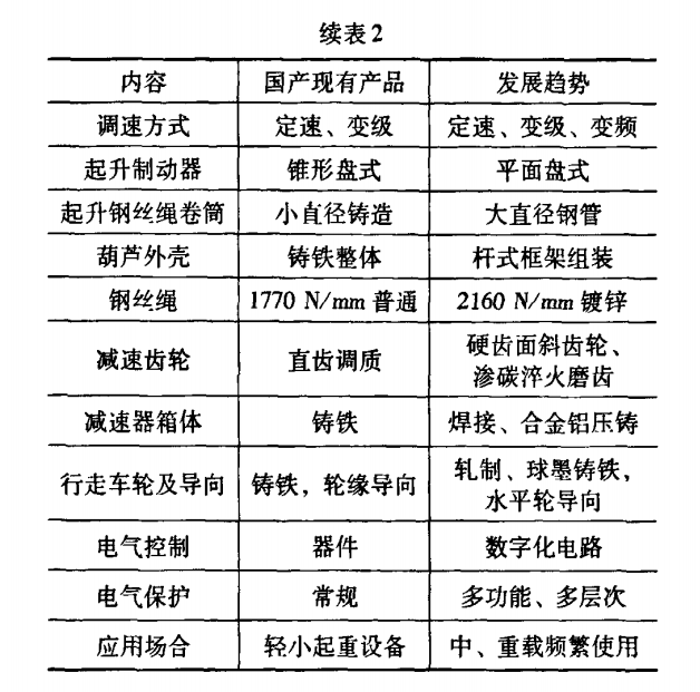 钢丝绳电动葫芦之后的发展方向应向重载、大型、高性能化、??榛⒄?,成为替代通用桥式起重机的发展趋势。新一代的电动葫芦与现有产品的构造特征对比表如下: