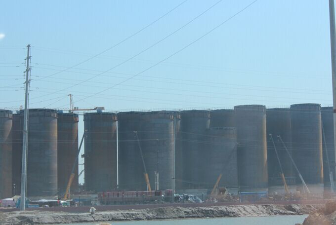 首先需要拼接油罐底板,在已拼接好的油罐底板上,布设一根中心平衡力和若干吊装立柱,在吊装立柱顶端挂手拉葫芦。其次,制作安装罐体上边一代壁板和罐顶、栏杆及其它附件。然后利用手拉葫芦吊装作用于壁板的胀圈,带动已成型的罐顶、罐壁、栏杆等向上提升,当提升到一定高度后(一般取吓呆壁板宽+50mm~70mm),再制作安装从上到下的第2带壁板。这样,反复进行,即可完成整个罐体的制作安装。