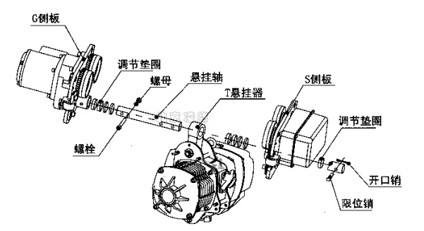 1、? 将悬挂轴插入侧板G,并用悬挂轴螺栓、螺母将其锁定